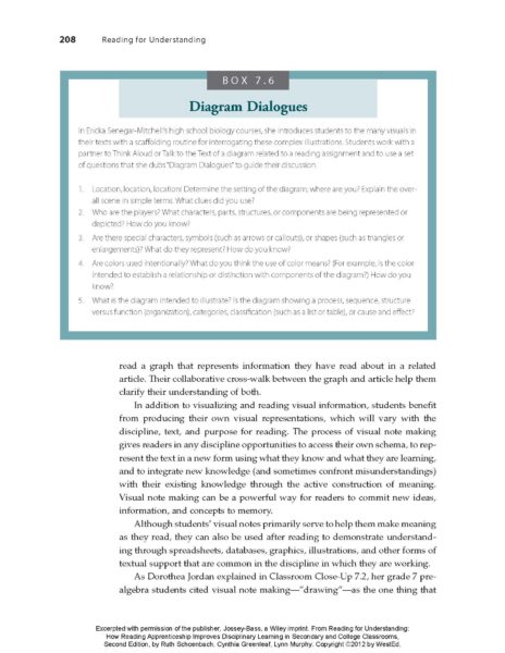 In Ericka Senegar-Mitchell’s high school biology courses, she introduces students to the many visuals in their texts with a scaffolding routine for interrogating these complex illustrations. Students work with a partner to Think Aloud or Talk to the Text of a diagram related to a reading assignment and to use a set of questions that she dubs “Diagram Dialogues” to guide their discussion.