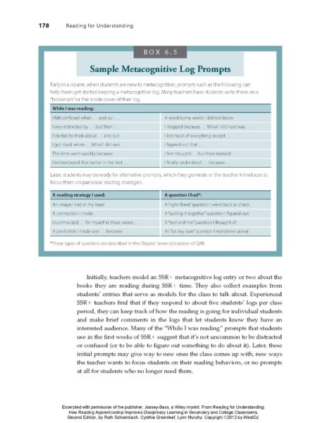 Early in a course, when students are new to metacognition, prompts such as the ones included here can help them get started keeping a metacognitive log. Many teachers have students write these on a “bookmark” or the inside cover of their log.