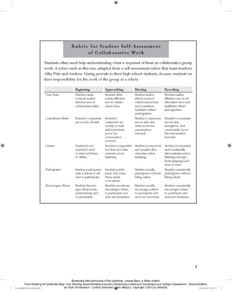 Students often need help understanding what is required of them in collaborative group work. A rubric such as this one, adapted from a self-assessment rubric that team teachers Allie Pitts and Andrew Hartig provide their high school students, focuses students on their responsibility for the work of the group as a whole.